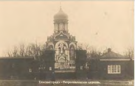 Поштова листівка з фотографією церковно-приходської школи при Петропавлівській церкві. На звороті підпис «На пам’ять освячення Петропавлівської школи. 12 грудня 1910 року». У середині 1930-х років Петропавлівська церква була зруйнована.