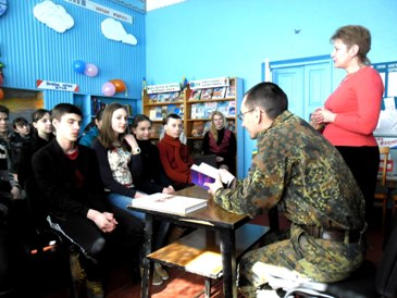 У Добровеличківській районній бібліотеці для дітей відбулася зустріч із учасником АТО Коваленком Миколою Петровичем. Семикласникам ЗШ № 1 було цікаво поспілкуватися з воїном-земляком, почути про читацькі уподобання в дитинстві – зачитувався історичними, пригодницькими книгами,серед яких особливе враження залишилося від прочитання оповідань збірки «Діти-герої», творів В. Нестайка, зокрема, його «Тореадори з Васюківки». Гість розповів і про себе, про свою професію фельдшера, яка так знадобилася на війні. Микола Петрович добровольцем був зарахований у Кіровоградський 42-й добровільний батальйон, мав позивний «Док», пройшов все пекло Іловайського котла, був поранений, лікувався і знову – на війну, але вже фельдшером. Багато бійців вдячні йому за вчасну кваліфіковану допомогу. Насамкінець зустрічі наголосив, що для того, щоб здобути цікаву професію потрібно багато читати і добре навчатися.